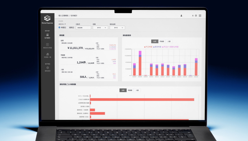 企業の個人立替経費の申請・承認データを元に、不正検知AIが自動的に不正や異常(不適切)な利用を検知するシステムです。AI技術を駆使し、経費申請データを時系列的かつ網羅的に解析することで、従来の目視では困難だった異常検知を可能にします。このDXにより、間接部門の生産性向上とガバナンスの強化を実現します。