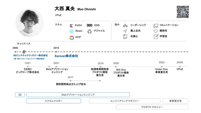 大西さんは2016年に同社に入社。関西開発拠点の立ち上げやエンジニアリング組織の拡大を経験し、現在はVPoE(Vice President of Engineering)として組織やチームを導く立場を担っています。さまざまな形で組織づくりやマネジメントに関わるなかで、大西さんはどのように考え、行動してきたのでしょうか。キャリアの節目ごとに参考にした書籍を交えて、これまでの歩みを振り返っていただきました。