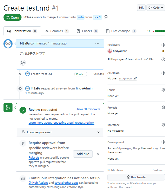 - メニューバーからPull requestsタブを開いて、概要を確認