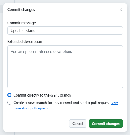 - 今回は同じブランチでいいので、Commit directly to the draft branchを選択