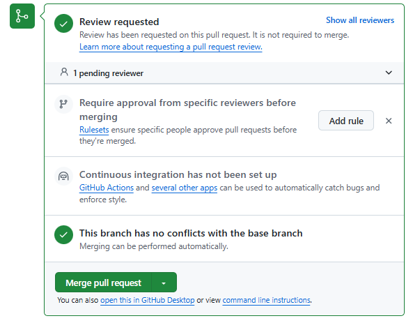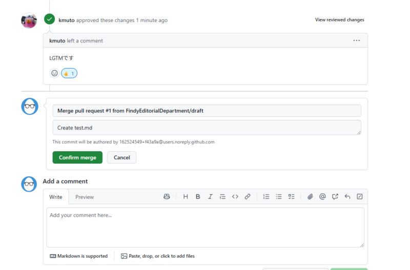 - Approve: 「OK、マージしましょう」の意で使う。リポジトリの設定でレビュー必須を有効化している場合はこれをしてもらわないとマージできない(ソフトウェアプロジェクトだとこうしているケースはわりとある)