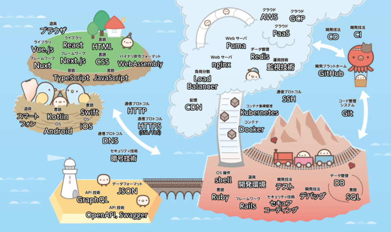 基本を学ぶと、Webサービスにはたくさんの技術が使われていることに気づきます。いま学んでいるこの技術は全体の中でどんな位置づけなのか、そして次は何を学べばいいのか、と悩む方も少なくないはずです。