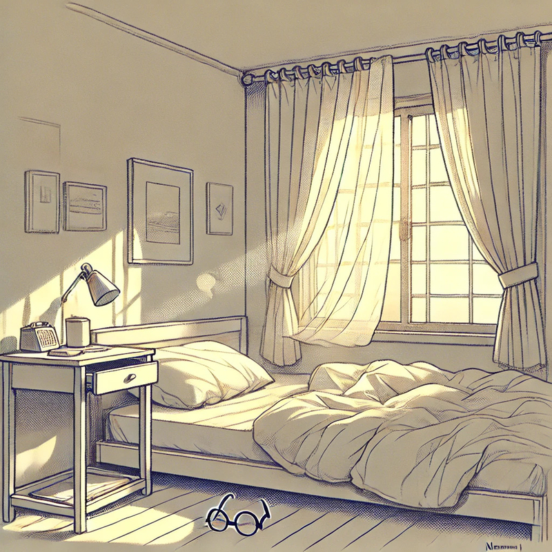 寝すぎたせいか少しけだるい身体をゆっくり起こしていくと、ふと何か違和感を覚える。はっきりとはわからない。それもそのはずだ。あたりの景色は極端に悪い視力と乱視のせいでぼんやりとしか見えないのだから。しかし、見えなくてもわかるのだ。“何かがおかしい”と。眼鏡をかけた瞬間、違和感の正体にようやく気が付く。