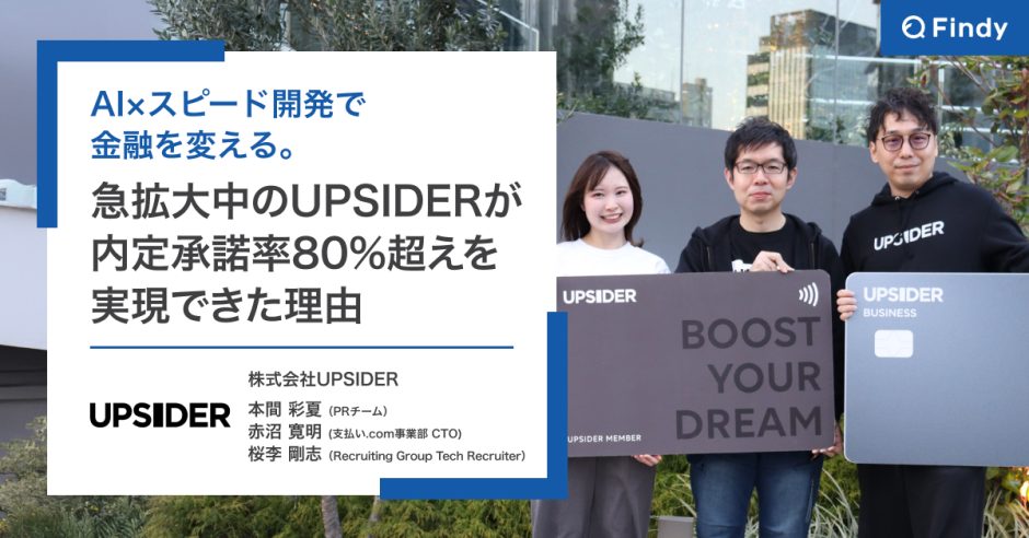 「挑戦者を支える世界的な金融プラットフォームを創る」をミッションに掲げ、AIとテクノロジーを駆使して「信用のアップデート」に挑む株式会社UPSIDER。 今回は、リクルーティングチームの桜李様と、2025年4月に「支払い.com」事業部のCTOとして入社された赤沼様に、入社の経緯から現在の開発体制、そしてFindyを活用したエンジニア採用の成功事例についてお話を伺いました。