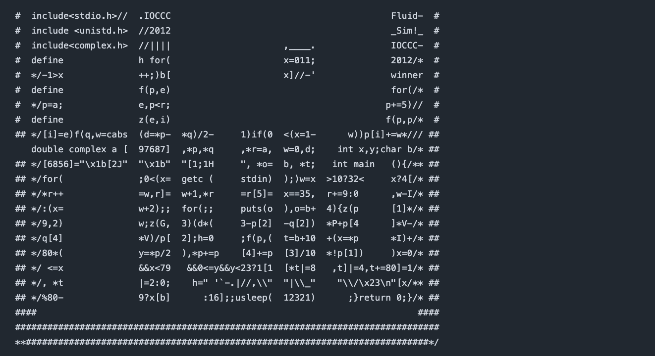 大学時代のプログラミングサークルですね。いろいろな領域に詳しい先輩がいて、「IOCCC」や「Quine」という概念をその方から教えてもらいました。当時知ったなかでも特に印象に残っているのは、「IOCCC 2000」の入賞作であるOmoikaneさんの作品です。これは本当に衝撃的でした。