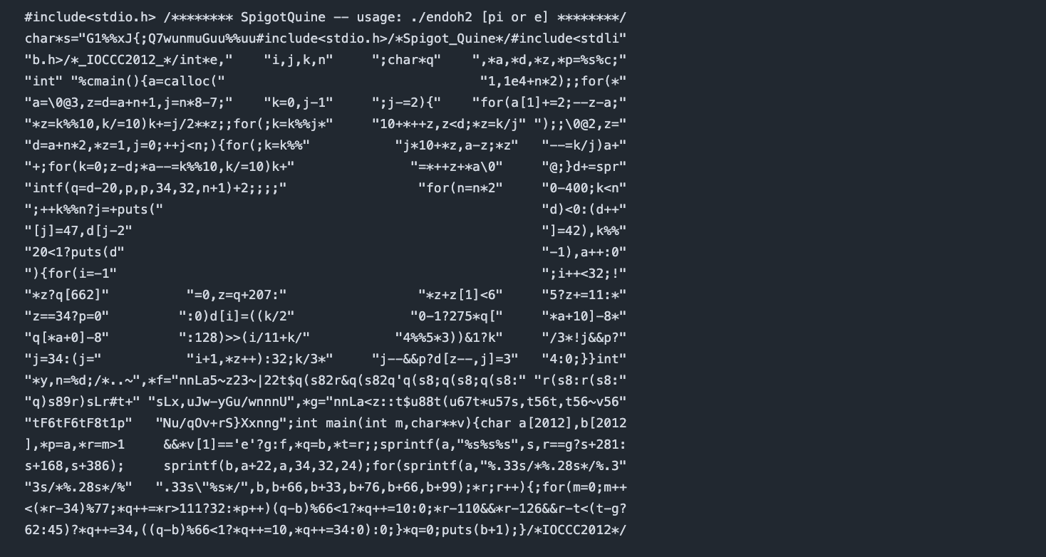 「spigot」は「蛇口」という意味なので、コード自体を蛇口の形にしました。実行するとπのアスキーアートが出てくるのですが、それをコンパイル・実行すると、縦書きで「3.14」と出力されます。そのコードを実行すると「3.14159……」となり、円周率が1桁ずつ増えていくQuineになっています。