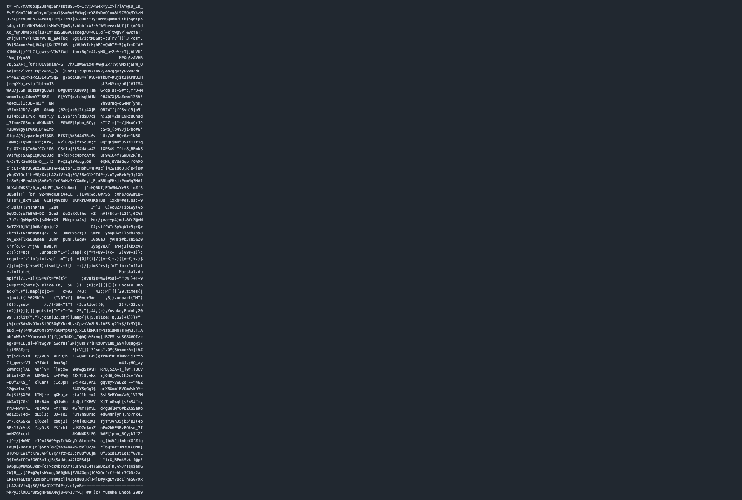 余談ですが、実はこのコード、最初はアスキーアートの形にできていませんでした。このコンセプトのコードを、特定の絵の形にするのは不可能だと思っていたんです。ところが、僕の初期版を見たDarren Smithさんという方が、「ハッシュ値に適合するように、欠損箇所を埋めながら自己修復するプロセス」をさらに効率化するアイデアを提案してくれました。