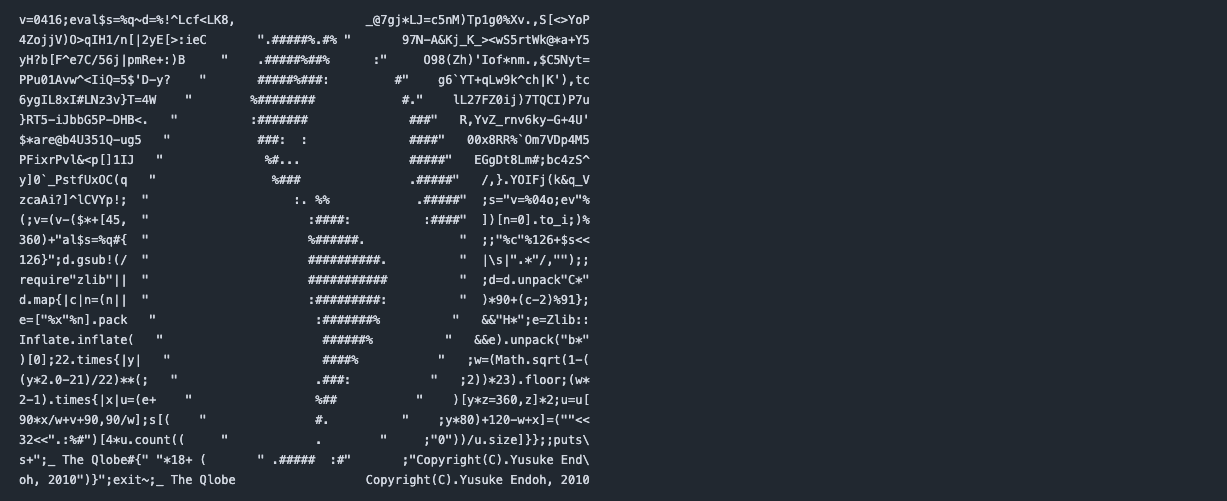 この「山手Quine」は2010年の「RubyKaigi」で発表して大きな反響をいただいたのですが、今度は海外の「RubyConf」でも発表したいという話が出てきました。ただ、山手線ネタは東京の人にしか通じません。そこで「海外の人にも伝わり、かつ回るものといったら何だろう?」と妻と話し、出てきたのが地球儀でした。そうして完成したのが、回転する地球を描く「Qlobe」です。実行するたびに、アスキーアートの地球が回っていきます。