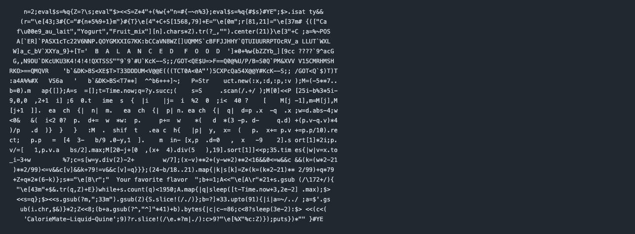 完成したときに一番感動したのは、「放射線耐性Quine」ですね。これは「コードの中のどの1文字を勝手に消しても、正しく動いて元のソースコードを復元する」という性質を持ったQuineです。本来の「放射線耐性」とは少し意味が違いますが、データの改変を検知して復元する「誤り訂正技術」から着想を得ました。正直、自分でも「本当にできるのか?」と半信半疑で作っていたので、動いたときはRubyの柔軟さに驚きました。今同じものを作れと言われても、できる自信がありません(笑)。