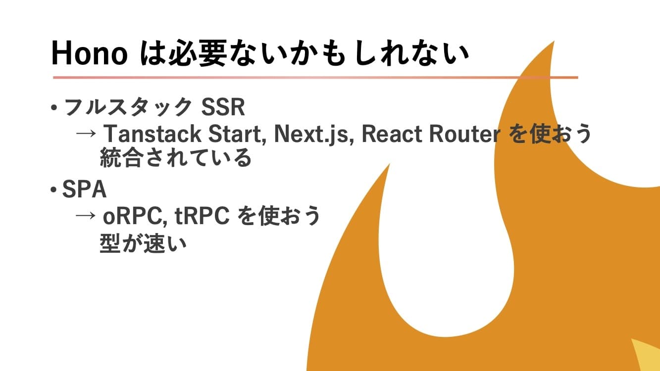 これは、例えばServer ActionsやServer Functionsがフレームワークに統合されていて、HonoなどのRPCライブラリを使わなくても通信ができるということです。Honoを使うのをやめて、これらを使いましょう。
