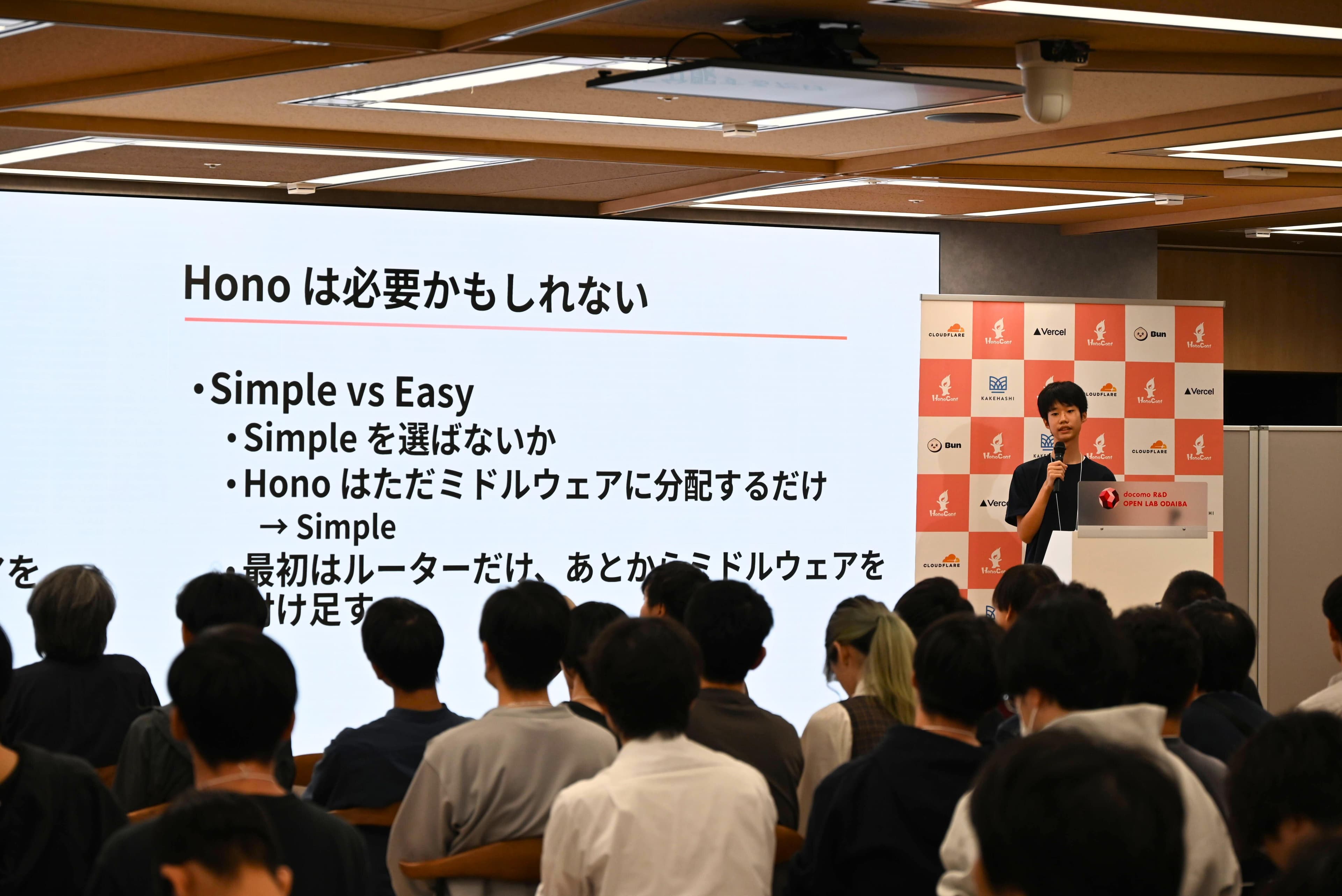 Keynoteには、HonoのWebSocket ヘルパーやConnInfo ヘルパーの開発者である、高校1年生のHonoコントリビューター、Shotaro Nakamura(@nakasyou0)氏が登壇しました。